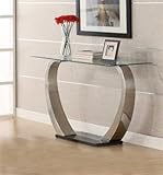 Description: This Sofa Table by Coaster is an ultra modern table that features a floating glass top and large scaled satin finish metal support with a high sheen black base. Matching end and coffee tables are also available. Bring some fresh atmosphere into your home interior with this wonderful collection!Dimension: SOFA TABLE -- COASTER 701239 (12X12X45.