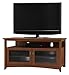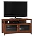 Assembled, measures 46-1/4 inches wide by 22 inches deep by 24-3/8 inches high; limited 1-year warranty. This attractive TV stand fits into both traditional and contemporary interiors, mixing classic decorative crown and base molding with framed fluted glass cabinet doors. From Bush Furniture’s My|Space collection of home furnishings, the Buena Vista TV stand features solid MDF and pressboard construction with a serene cherry finish. Post legs provide a sturdy base for the TV stand, which supports a 46-inch TV screen weighing up to 117 pounds. An upper open bay offers room for two components, like a Blu-Ray player or a cable box. Beneath the open bay, glass cabinet doors protect two additional bays for further media component storage, or for stowing DVDs or CDs. Signals from component remote controls transmit through the glass doors for user convenience. Equipped with stylish oil-finished bronze handles, the doors open with ease on European-style hinges. Each storage bay benefits from two preinstalled holes in the unit’s back panel and provides zip ties for organized wire management.