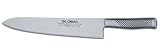 Hand wash recommended. Global heavy weight 11-inch chef's knife This heavy weight Global knife has more heft and a thicker blade than the knives in our classic G series. This is an excellent all-purpose knife for those that prefer a longer blade. Loved by professional chefs around the world, Global knives are an excellent choice for the serious home cook. The thin and razor sharp Global blade allows the cook to cleanly slice through foods, preserving the integrity of the ingredient and maximizing its flavor. The majority of Global knives are ground to a straight point rather than the western style of beveling the edge. To balance their knives Global uses a hollow handle that is filled with just the right amount of sand to create the correct balance. The handle has its own unique darkened dimples for a non-slip grip. Global knives have a smooth contour and seamless, all stainless construction that eliminates food and dirt traps. Global knifes are forged in Japan from CROMOVA 18 Stainless Steel, a blend of 18-percent chromium for good stain resistance plus molybdenum and vanadium which gives excellent edge retention.